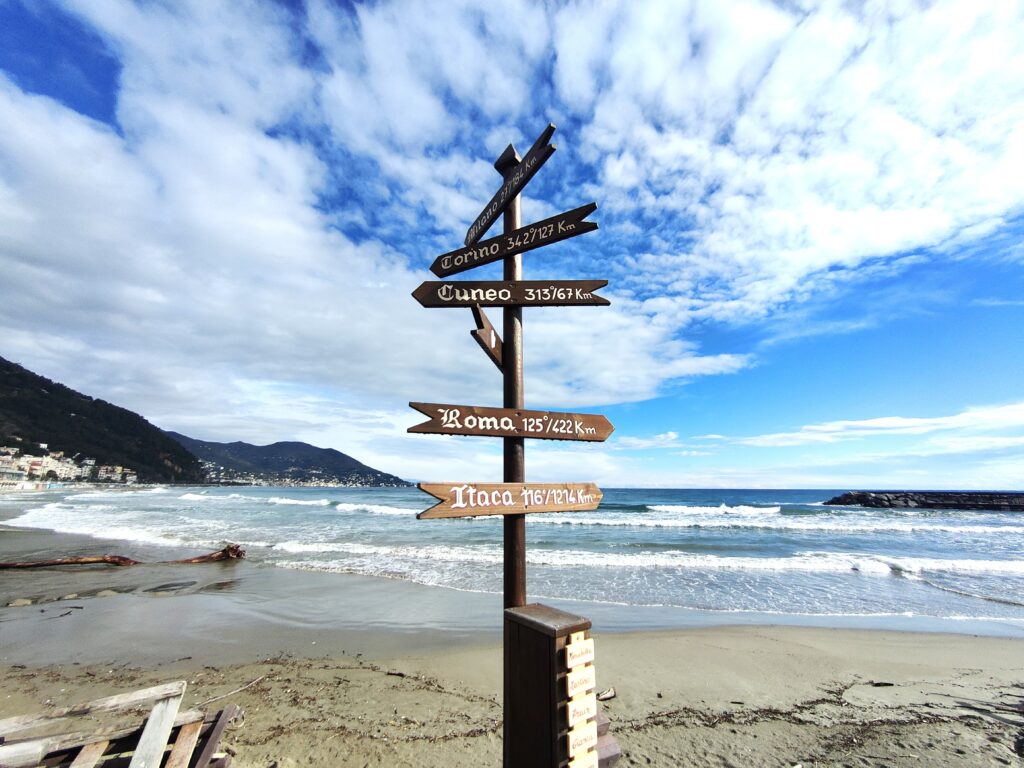 Passato il Bastione di Levante, e accanto alla Calina, abbiamo trovato un cartello delle distanze. Indica i chilometri che ci separano da grandi e piccoli luoghi in Italia: Milano, Torino, Cuneo, Roma. E poi ovviamente un riferimento all’isola dove Ulisse era re, Itaca, che si trova a 1214 chilometri di distanza.