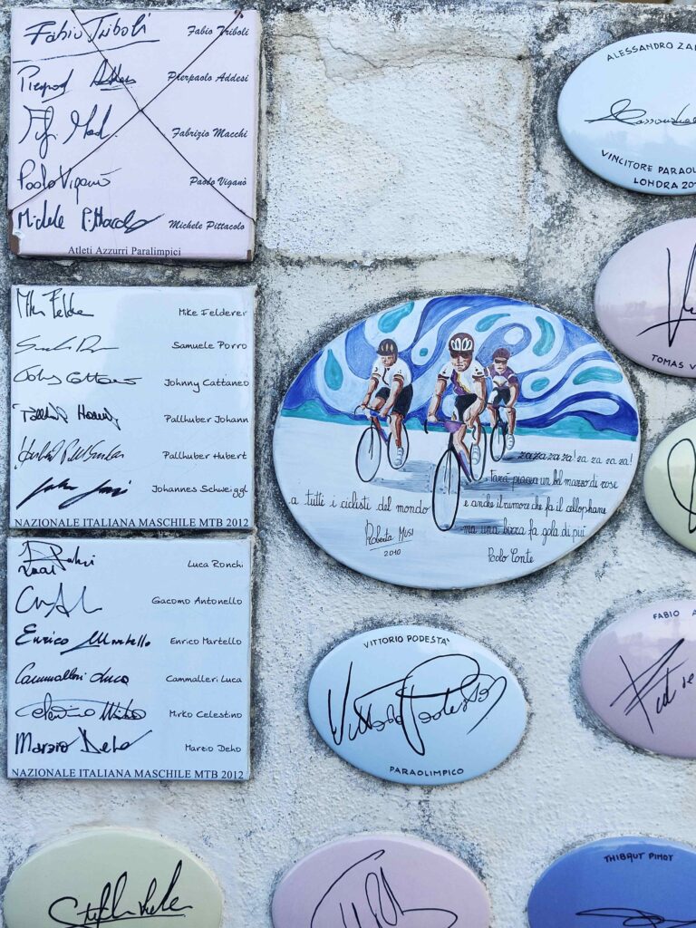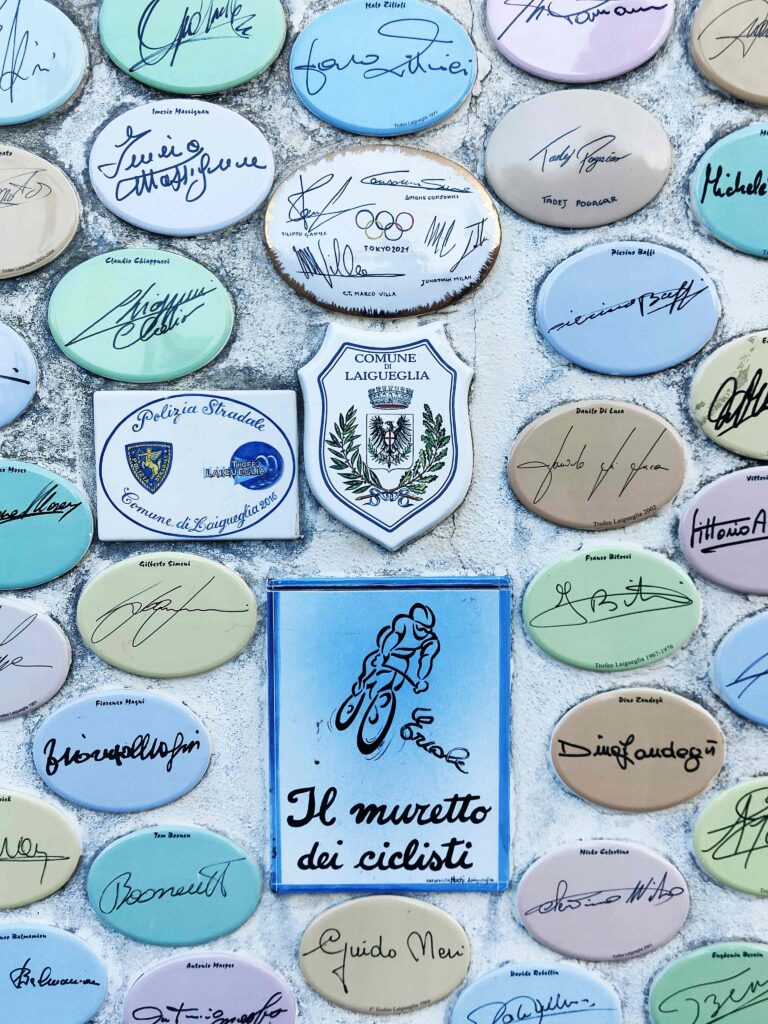 Anche Laigueglia, come Alassio, ha il suo muretto, ma non di celebrità tutte assieme nello stesso calderone. Qui ilmuretto è diverso… un album delle figurine Panini dei ciclisti, ma fatto di ceramica. Questo muretto è nato per celebrare il Trofeo Laigueglia, la gara che ogni anno apre la stagione del ciclismo professionista in Italia. Ci siamo divertiti a cercare gli autografi di corridori famosi: Merckx , Coppi e in particolare Pogačar, il cugino della nostra amica slovena Ana). Trovate il muretto dei ciclisti in piazza dei Pescatori, vicino al Bastione.