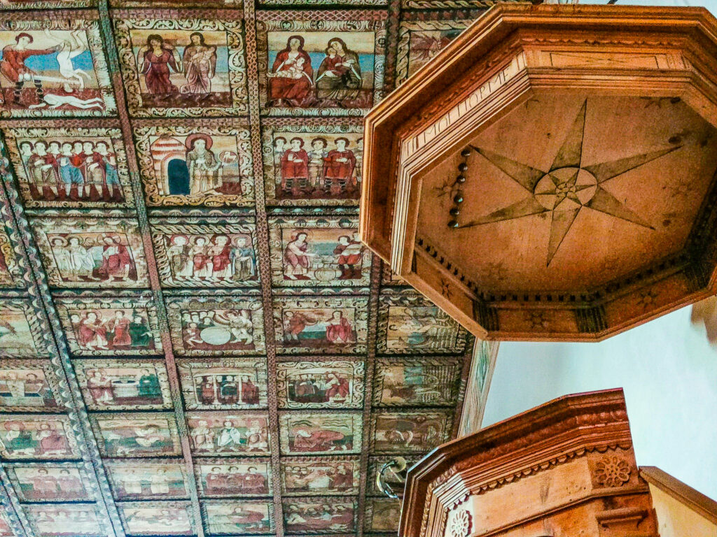 La particolarità del soffitto della chiesa di San Martino a Zillis non è solo l’antichità, ma il suo linguaggio visivo. E’ composto da 153 tavole quadrate, dipinte con colori vibranti, che raccontano storie di mostri marini, navi, cavalieri e scene della vita di Gesù. È come un enorme fumetto medievale. Per i piccoli esploratori, si trasforma in una divertente caccia al tesoro: “Chi trova per primo il mostro con la coda di pesce?” o “Dov’è il re a cavallo?”. Consiglio: usate il cellulare per scattare le foto al soffitto e vedere i dettagli da vicino. Inoltre vi salva la cervicale!