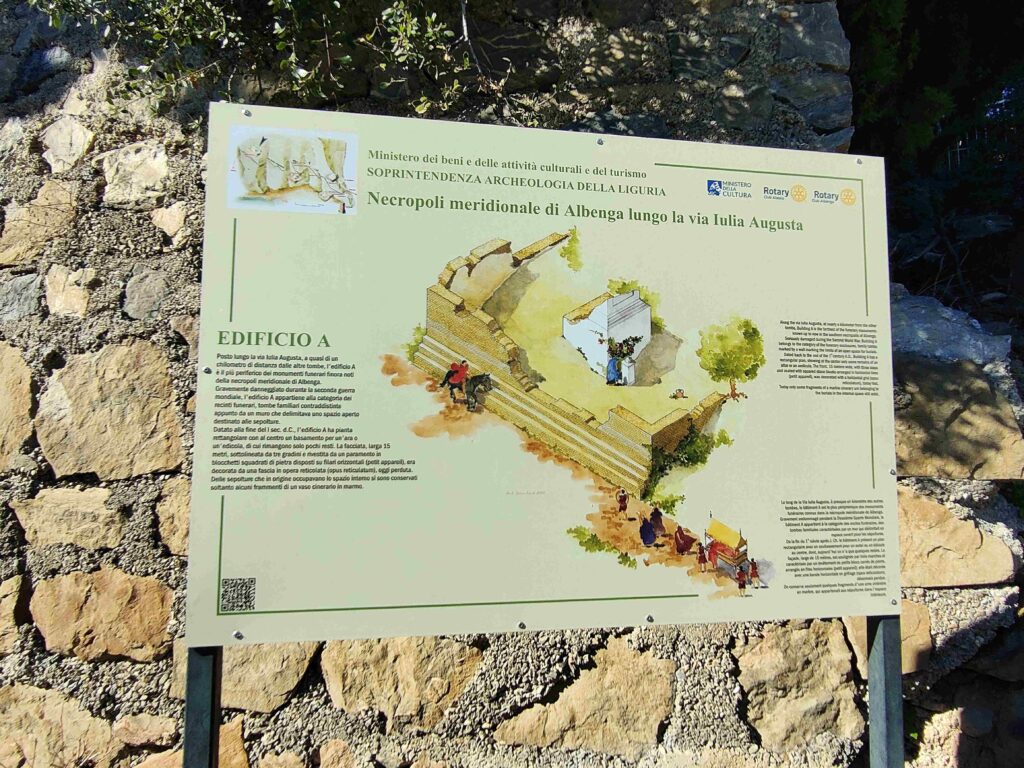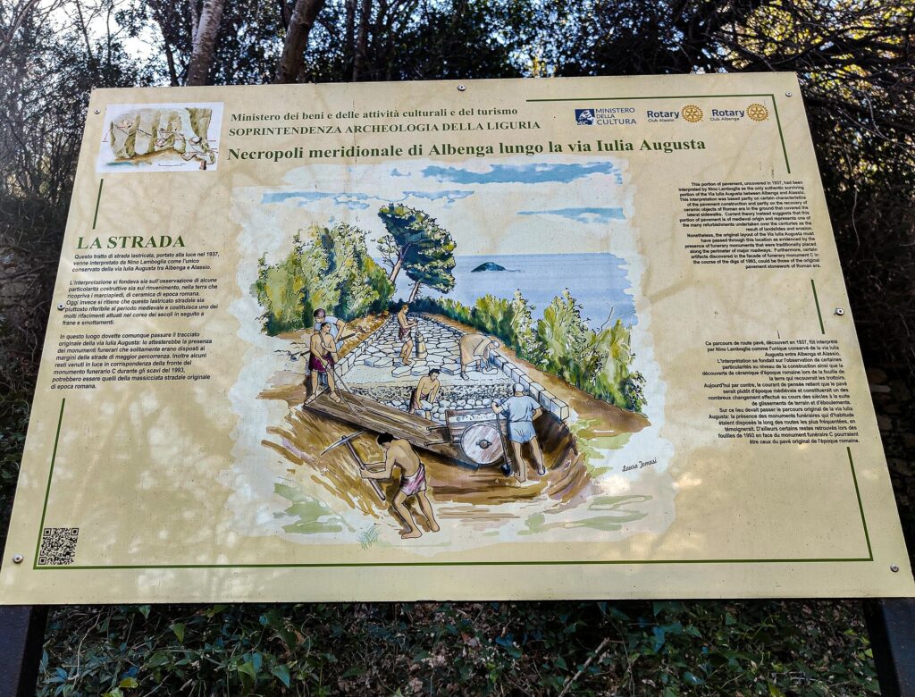 Se come non siete esperti di archeologia e di antica Roma, prendetevi il tempo di leggere i cartelli didattici lungo questa strada romana della Liguria. Quello che sembra ad esempio un semplice muro, era una tomba ad edicola. Insomma, si imparano davvero molte cose interessanti.